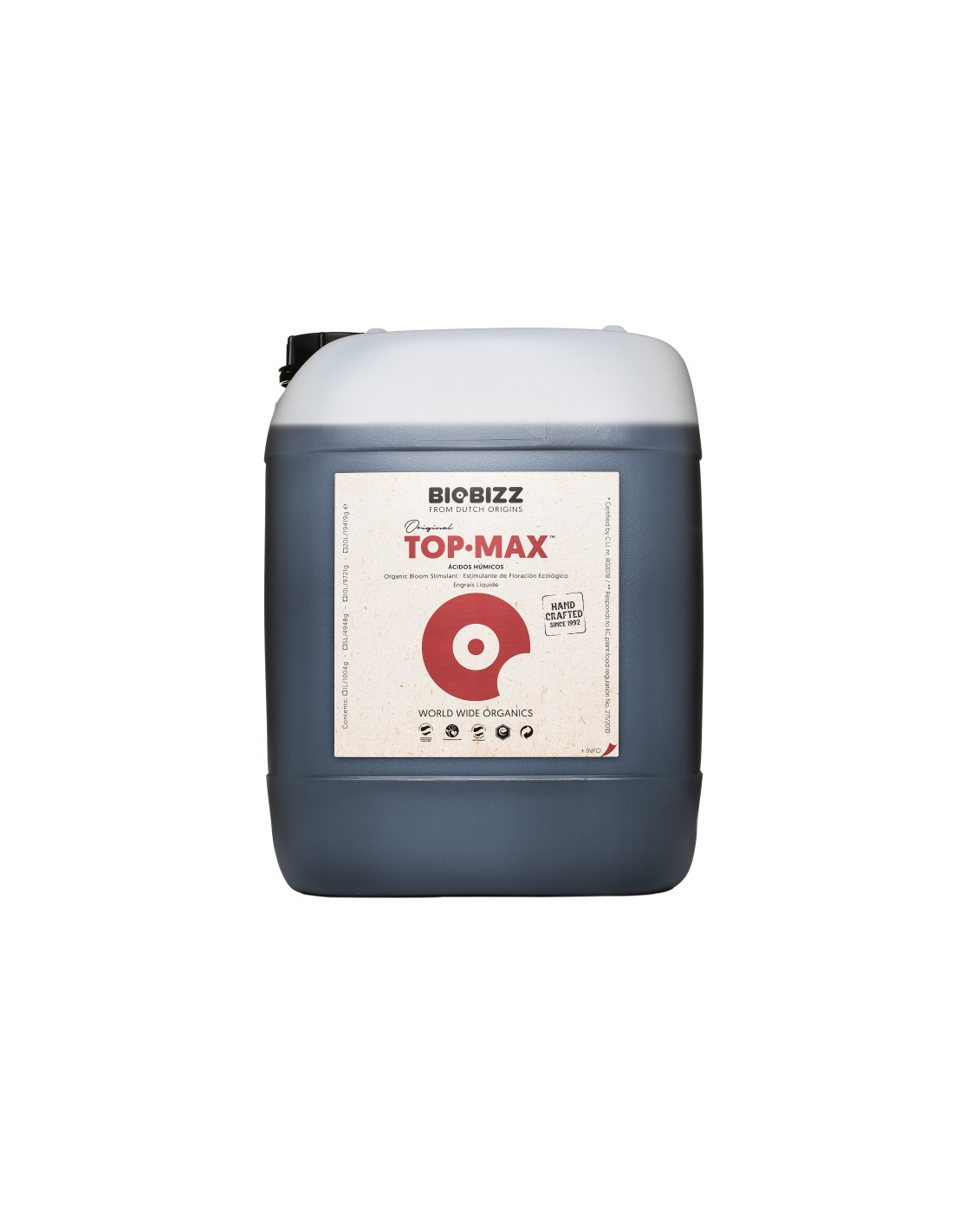 Top·Max™ se puede utilizar durante todo el periodo de floración, y funciona especialmente bien combinado con las mezclas de sustrato Biobizz. En las primeras semanas de crecimiento, recomendamos una dosis de 1 ml por litro de agua. A medida que se aproxima la recolección y antes de proceder al enjuague (cuando la solución de nutrientes se sustituye por agua limpia para mejorar el sabor y la textura de la cosecha), la dosis se puede aumentar hasta los 4 ml por litro de agua. Consulta nuestra tabla de aplicación para obtener unos resultados óptimos.