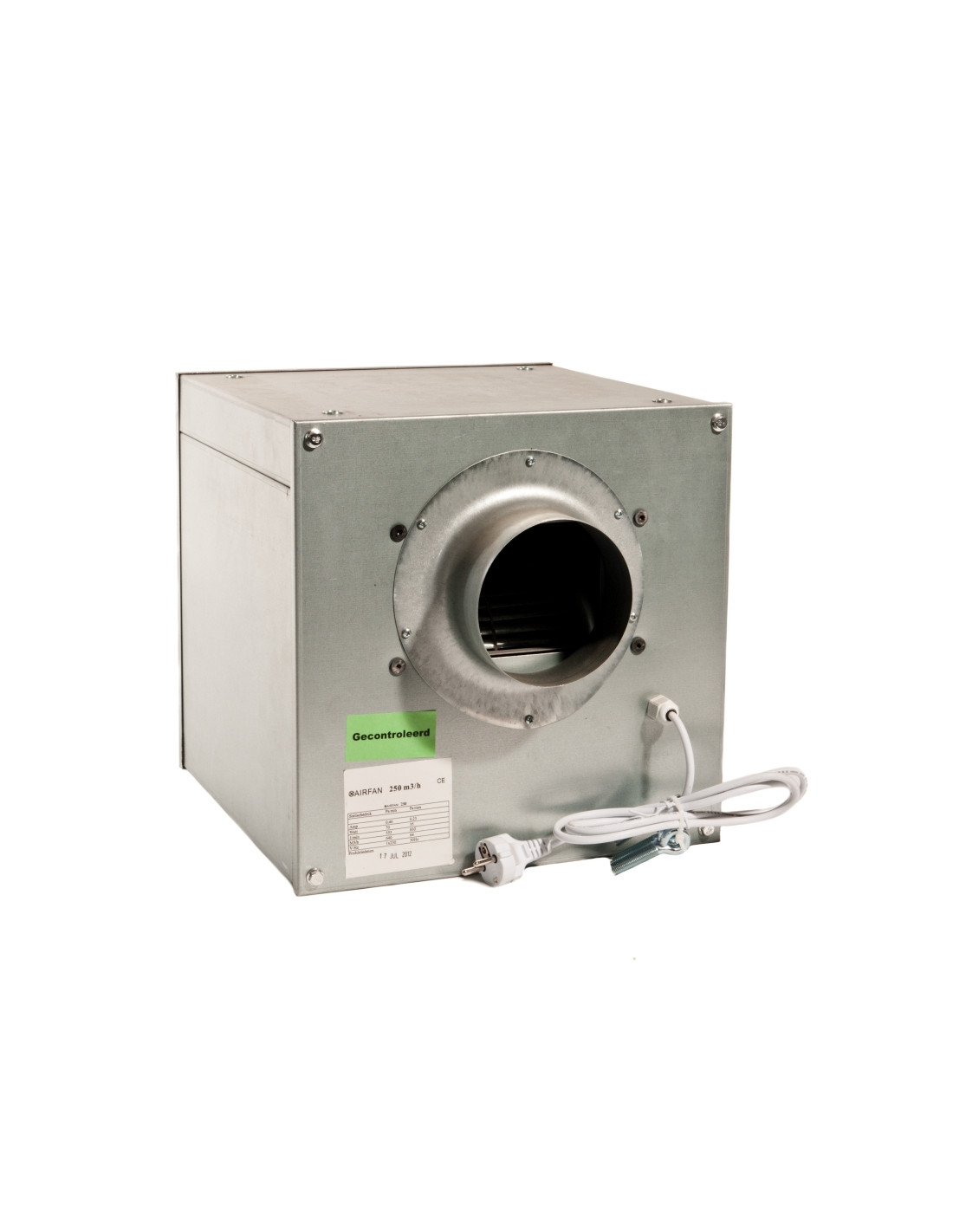 Caja de ventilación insonorizada, fabricada de chapa metálica. Potente motor interno, se sirve montada, con manguitos corona y 4 tornillos gancho.