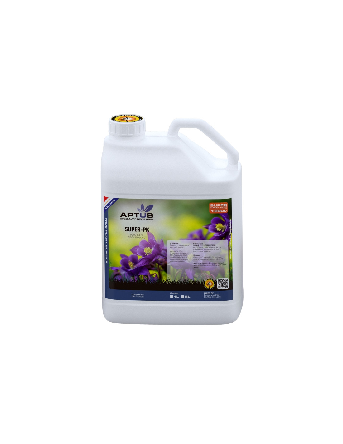 Las plantas necesitan más fósforo y potasio durante la fase de floración. Super-PK contiene estos minerales esenciales y otros aditivos estimulantes de la floración en altas concentraciones, que ofrecen un resultado óptimo durante la fase de floración. Super-PK contiene un 20 % de fósforo, un 25 % de potasio, aminoácidos estimuladores de la floración y vitam