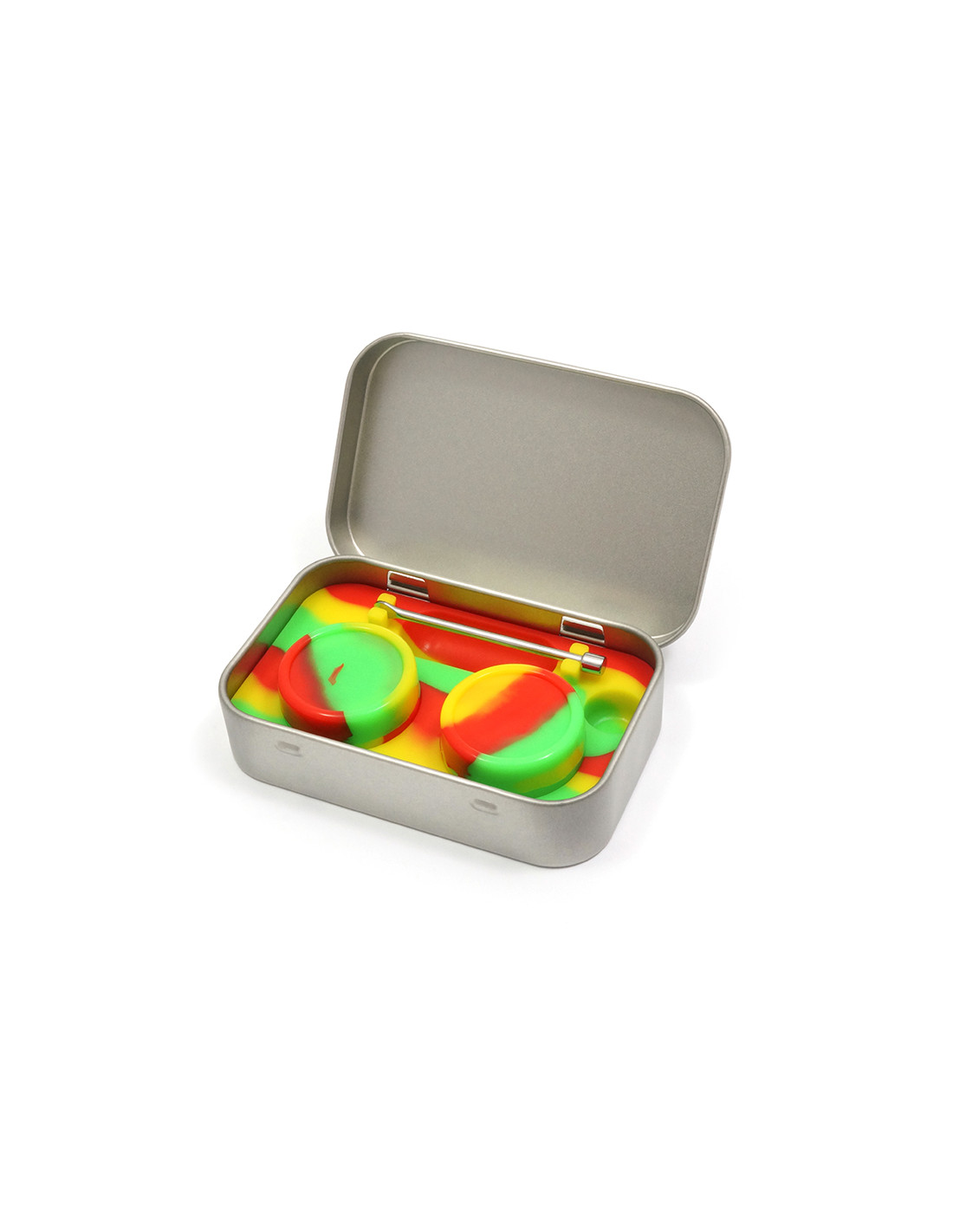 El kit incluye: Bandeja de silicona 2 container de silicona 5ml Caja metálica dabber