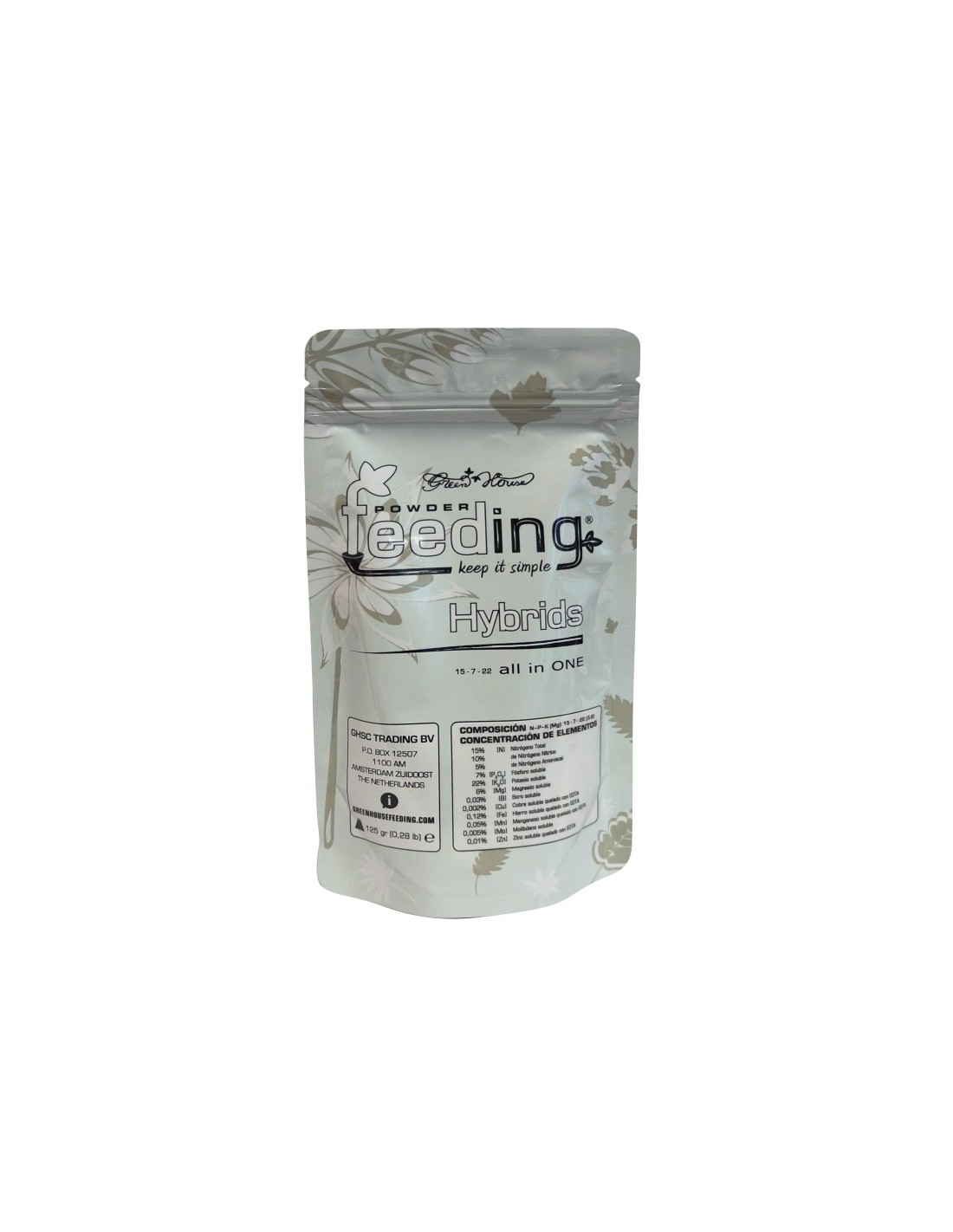 Green House Powder Feeding, fertilizante en polvo. Específicamente elaborado para plantas híbridas, "Hybrids Powder Feeding" ofrece el balance perfecto de nutrientes para las necesidades metabólicas de todas las variedades híbridas. Puede ser utilizado en tierra, coco, cultivos hidropónicos y aeroponía con muy buenos resultados. Está diseñado para todo el cultivo, desde la germinación hasta la cosecha, proporcionando la mejor nutrición durante el crecimiento vegetativo y floración. La acumulación de sal en el medio es mínima, requiriendo menos lavados del medio. Se puede utilizar en cualquier variedad que tenga una floración de 8 a 10 semanas, y tiene los mejores resultados en las variedades que van desde 40% a 60% índica /sativa.