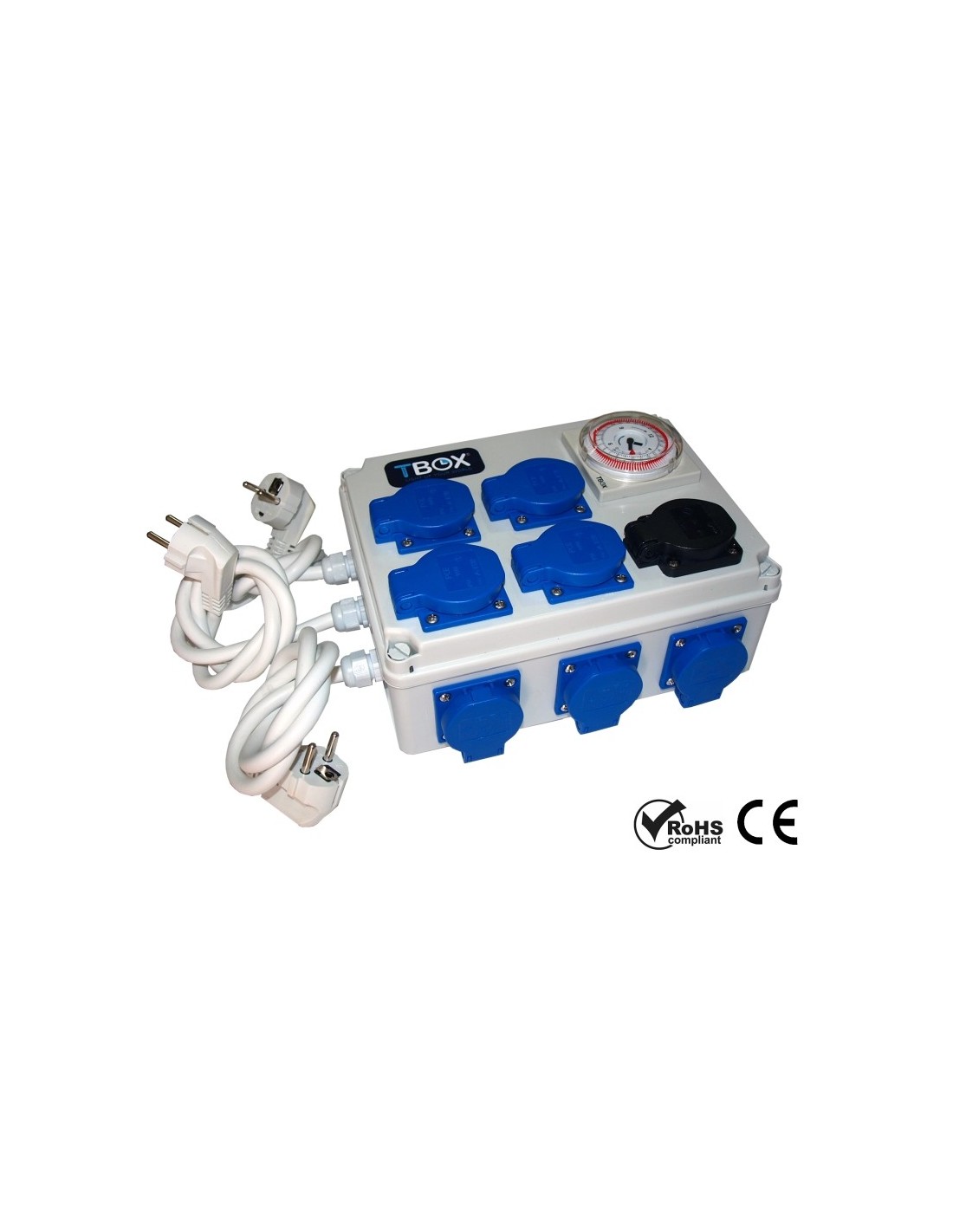 TBOX 12H:es una caja temporizadora multibase que controla un máximo de 12 accesorios de 630w., 12 de 600w., 16 de 400w., 24 de 315w. ó 6 de 1.000w. Incorpora una toma auxiliar de calefacción de color negro, situada en la parte superior, esta se activa cuando el resto de tomas están apagadas, lo que nos permite mantener, mediante un calefactor, la temperatura idónea de la sala.