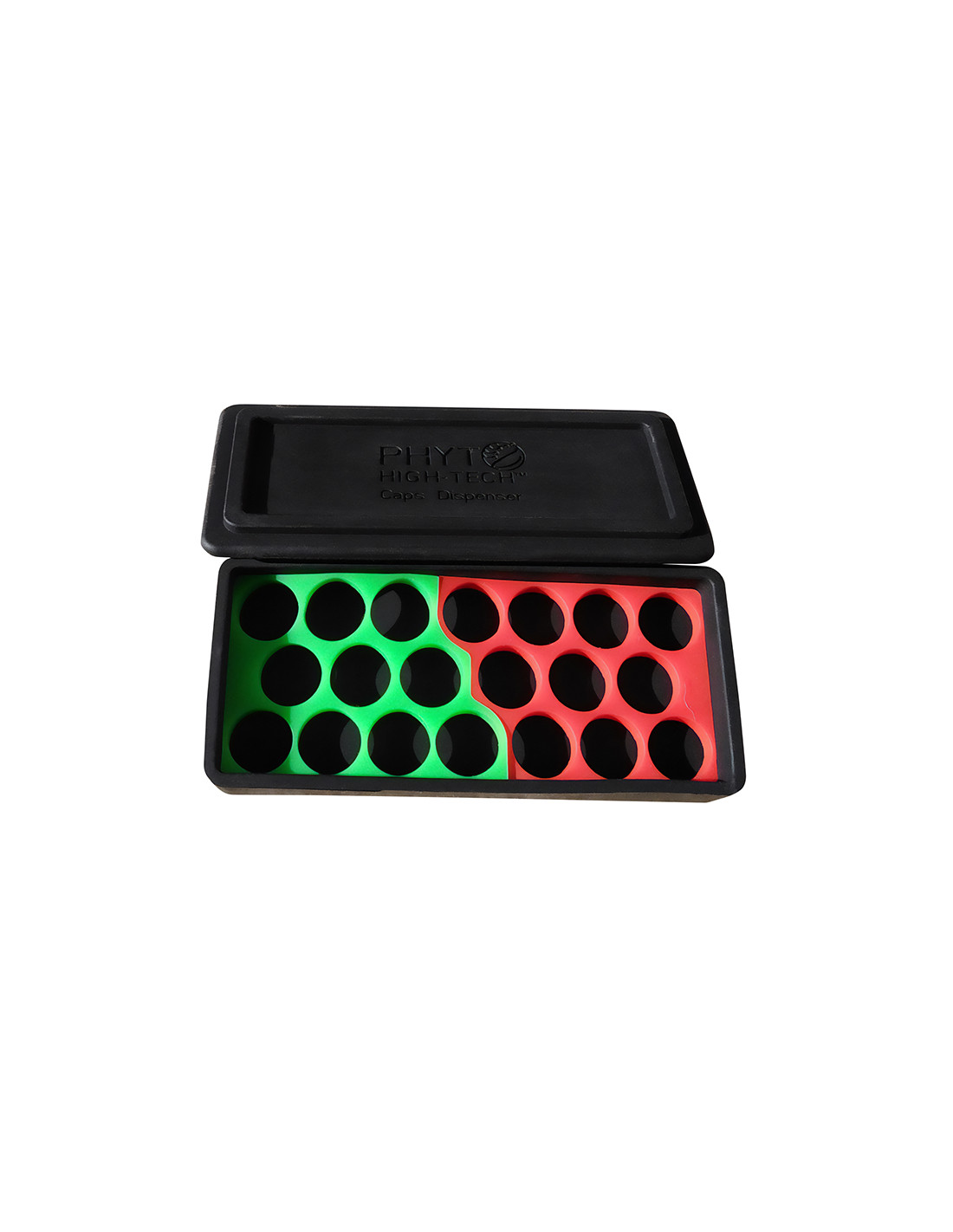 Caja de transporte de cápsulas inteligente con dos zonas, la roja para las cápsulas usadas y la verde para las cápsulas listas para vaporizar.
