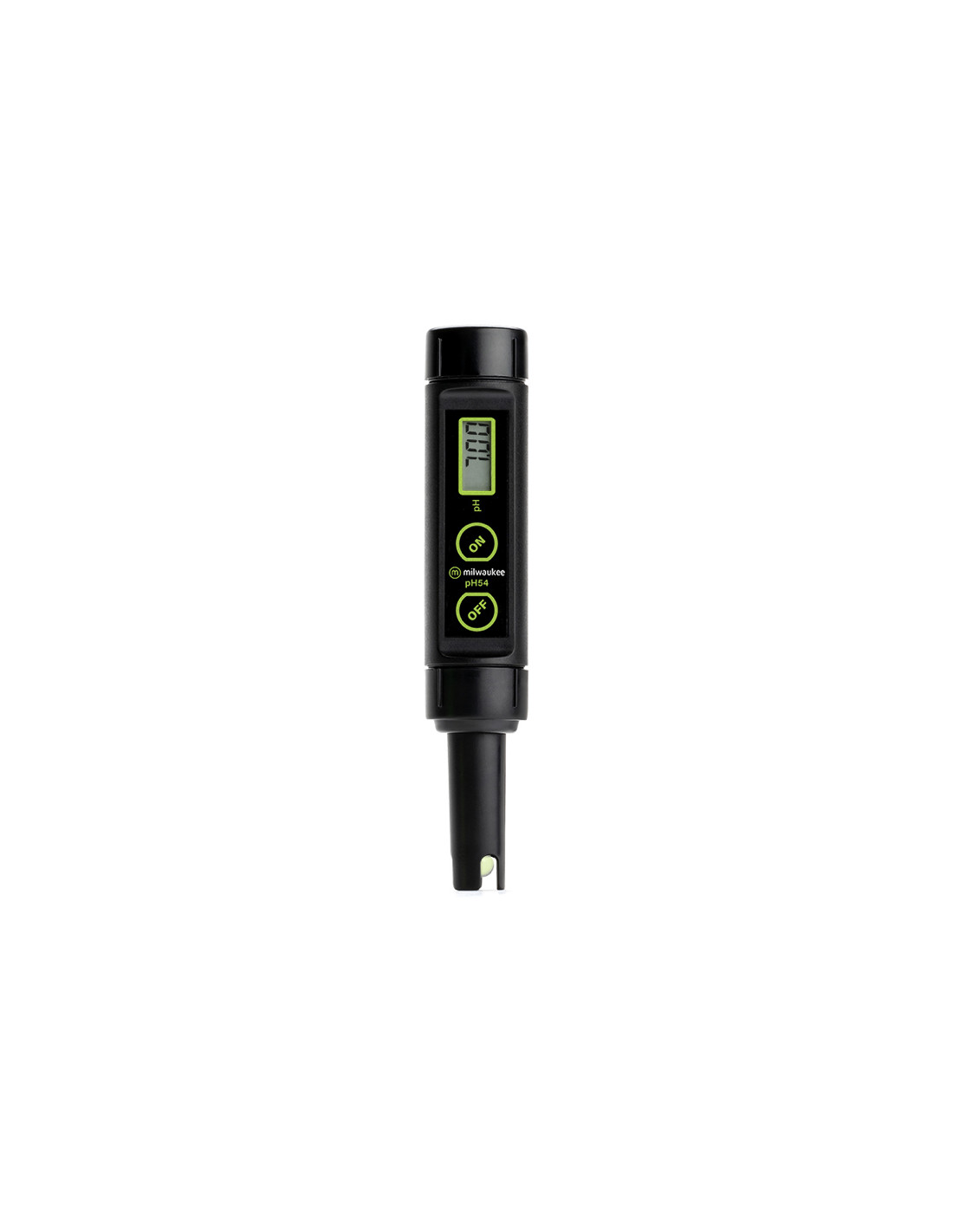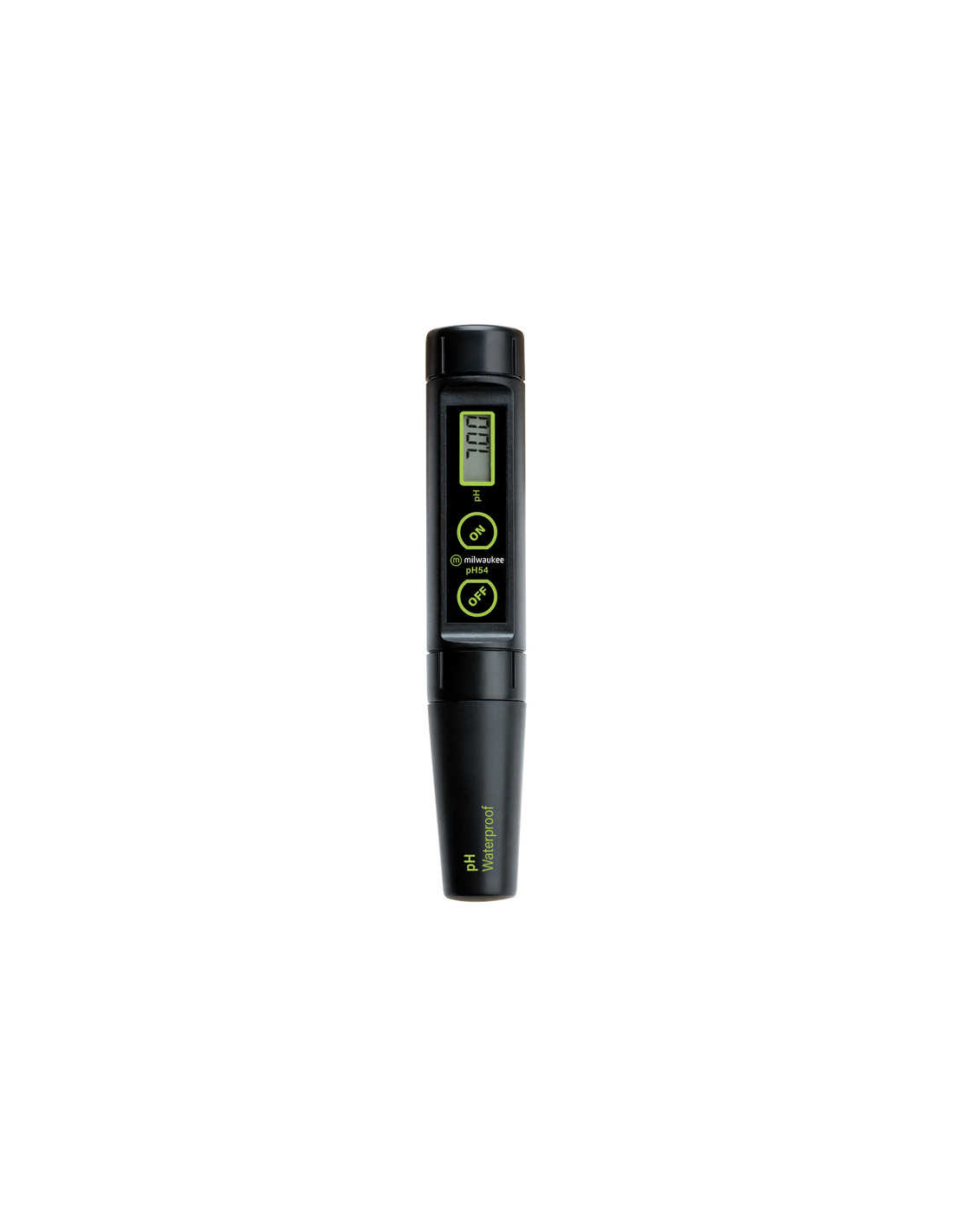 PH-Metro de bolsillo resistente a salpicaduras. Calibración automática y reconocimiento del líquido de calibración. Compensación automática de la temperatura. Función de auto-apagado en 10 minutos. Se presenta con solución calibradora.