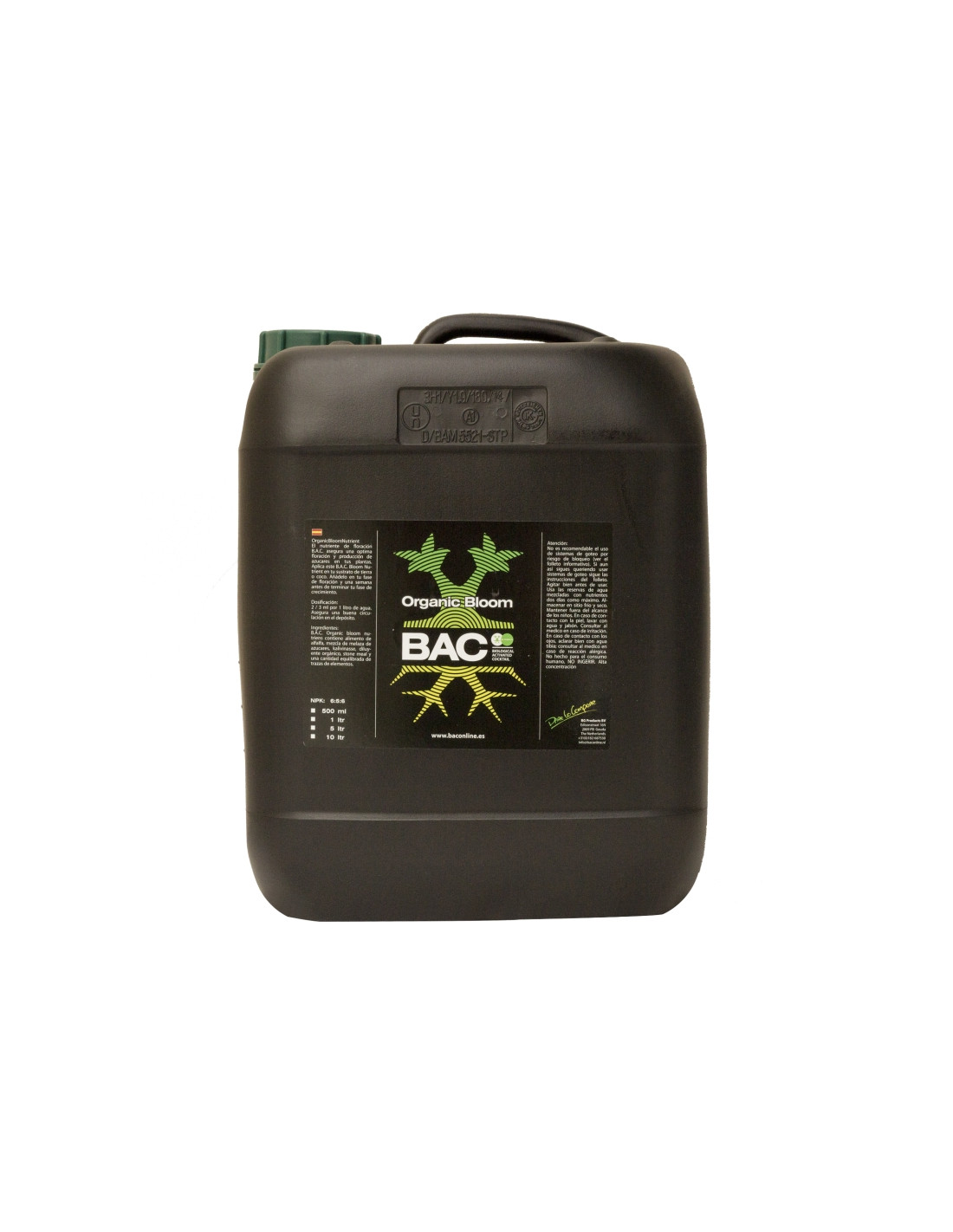La equilibrada B.A.C Organic Bloom garantiza que tus plantas consigan todos los nutrientes que necesitan. Esto permitirá un mejor y más rápido desarrollo durante la fase de floración. Tendrás principalmente una exuberante creación y formación de flores... En combinación con el estimulador de floración B.A.C, Organic Bloom hará tu cosecha más resistente contra toda clase de enfermedades del suelo, (Phytium, Fusarium), insectos y plagas (thrips, araña roja) y cualquier error de clima cometido por el cultivador. El uso de estimulador de floración B.A.C y la aplicación de B.A.C Funky Fungi activan micro-organismos útiles de tal manera que tus plantas se beneficiarán de una óptimamente equilibrada vida del suelo. Altamente concentrado.