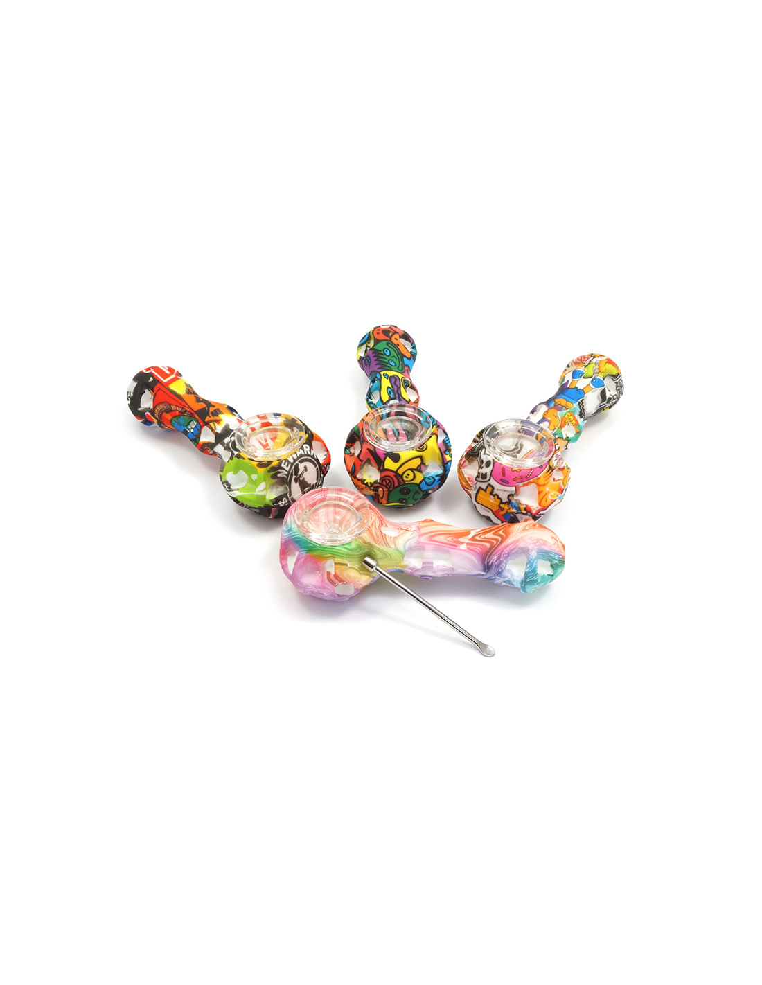 PIPA DE SILICONA SPOON CON IMPRESION WATER TRANSFER, BOL DE VIDRIO Y DABBER DE ACERO INOXIDABLE