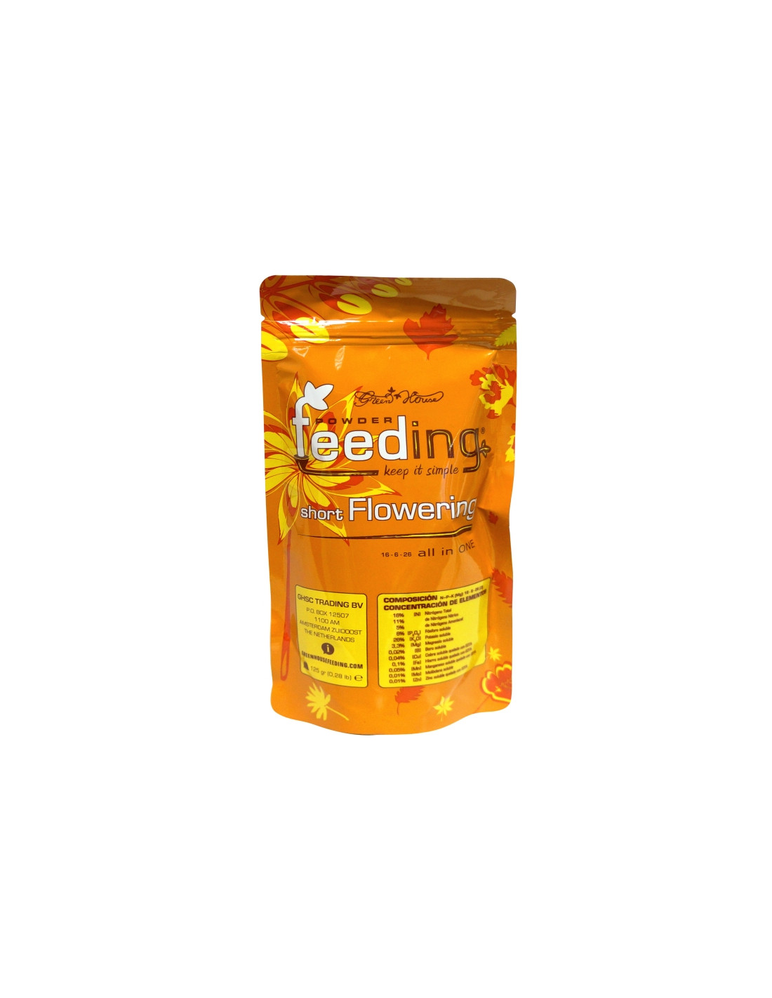 Green House Powder Feeding, fertilizante en polvo. Específicamente elaborado para plantas de variedad indica, "Short Flowering Powder Feeding" ofrece el balance perfecto de nutrientes para las necesidades metabólicas de todas las variedades de floración rapida. Puede ser utilizado en tierra, coco, cultivos hidropónicos y aeroponía con muy buenos resultados. Se puede utilizar en cualquier variedad en la que la floración sea de 9 semanas o menos, como las kush o la white family y se obtiene un mejor resultado en las variedades que contienen al menos un 60% de genética índica y en las plantas de autofloración