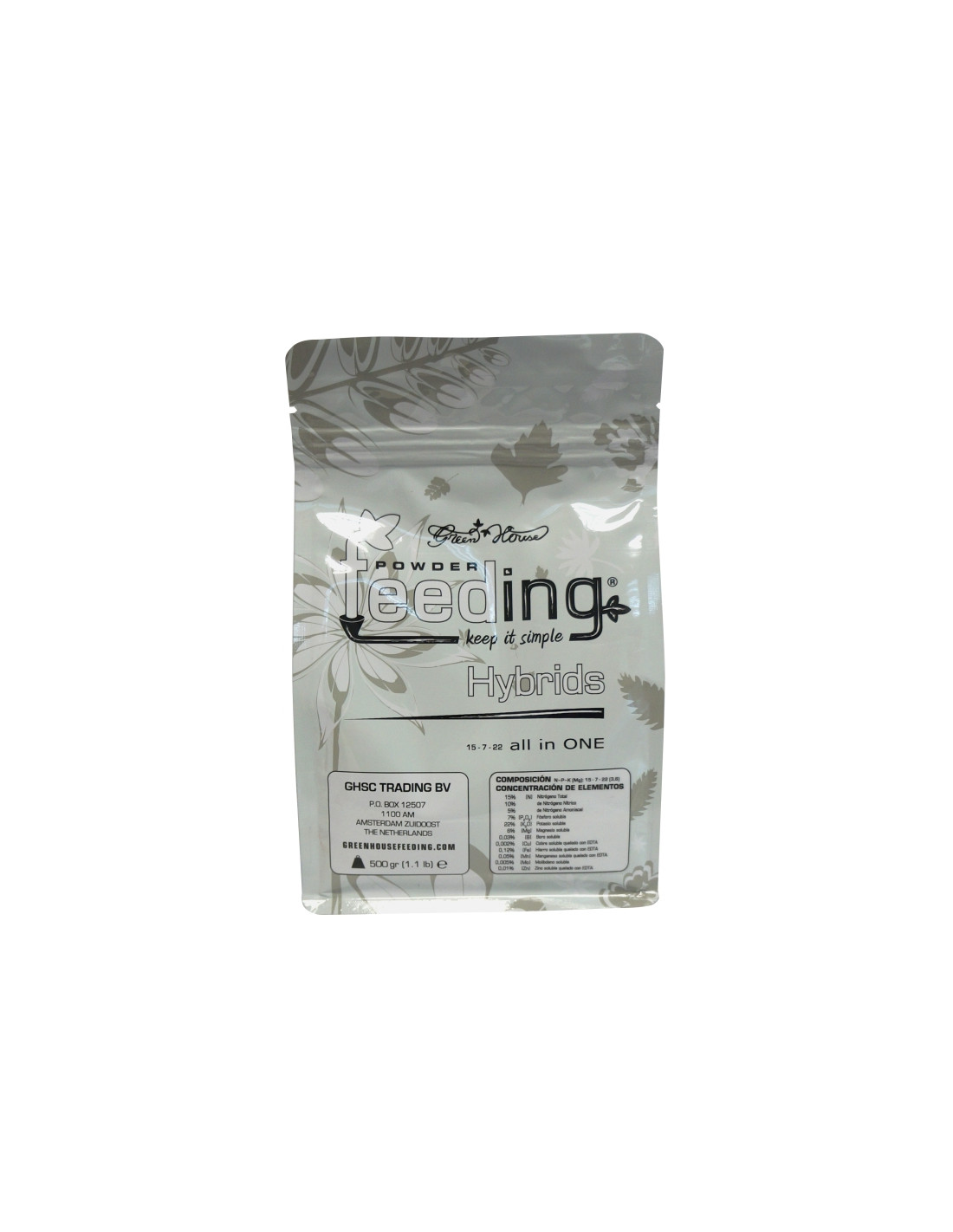 Green House Powder Feeding, fertilizante en polvo. Específicamente elaborado para plantas híbridas, "Hybrids Powder Feeding" ofrece el balance perfecto de nutrientes para las necesidades metabólicas de todas las variedades híbridas. Puede ser utilizado en tierra, coco, cultivos hidropónicos y aeroponía con muy buenos resultados. Está diseñado para todo el cultivo, desde la germinación hasta la cosecha, proporcionando la mejor nutrición durante el crecimiento vegetativo y floración. La acumulación de sal en el medio es mínima, requiriendo menos lavados del medio. Se puede utilizar en cualquier variedad que tenga una floración de 8 a 10 semanas, y tiene los mejores resultados en las variedades que van desde 40% a 60% índica /sativa.
