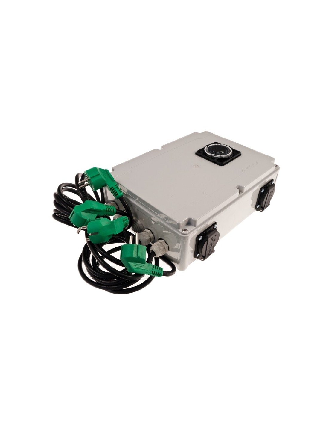 Temporizador que nos permite controlar 16 lamparas de 600w ó 20 de 400w Dimensiones: 21 x 29 x 9cm Max. salida: 15 Amp Nivel de aislamiento: IP 44