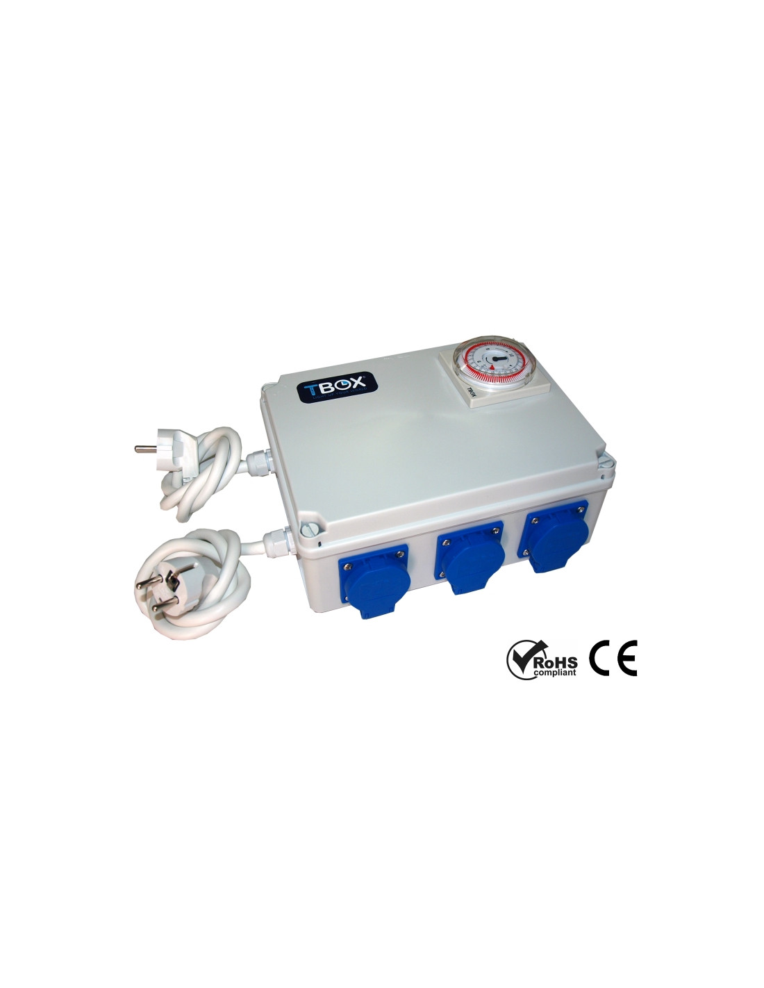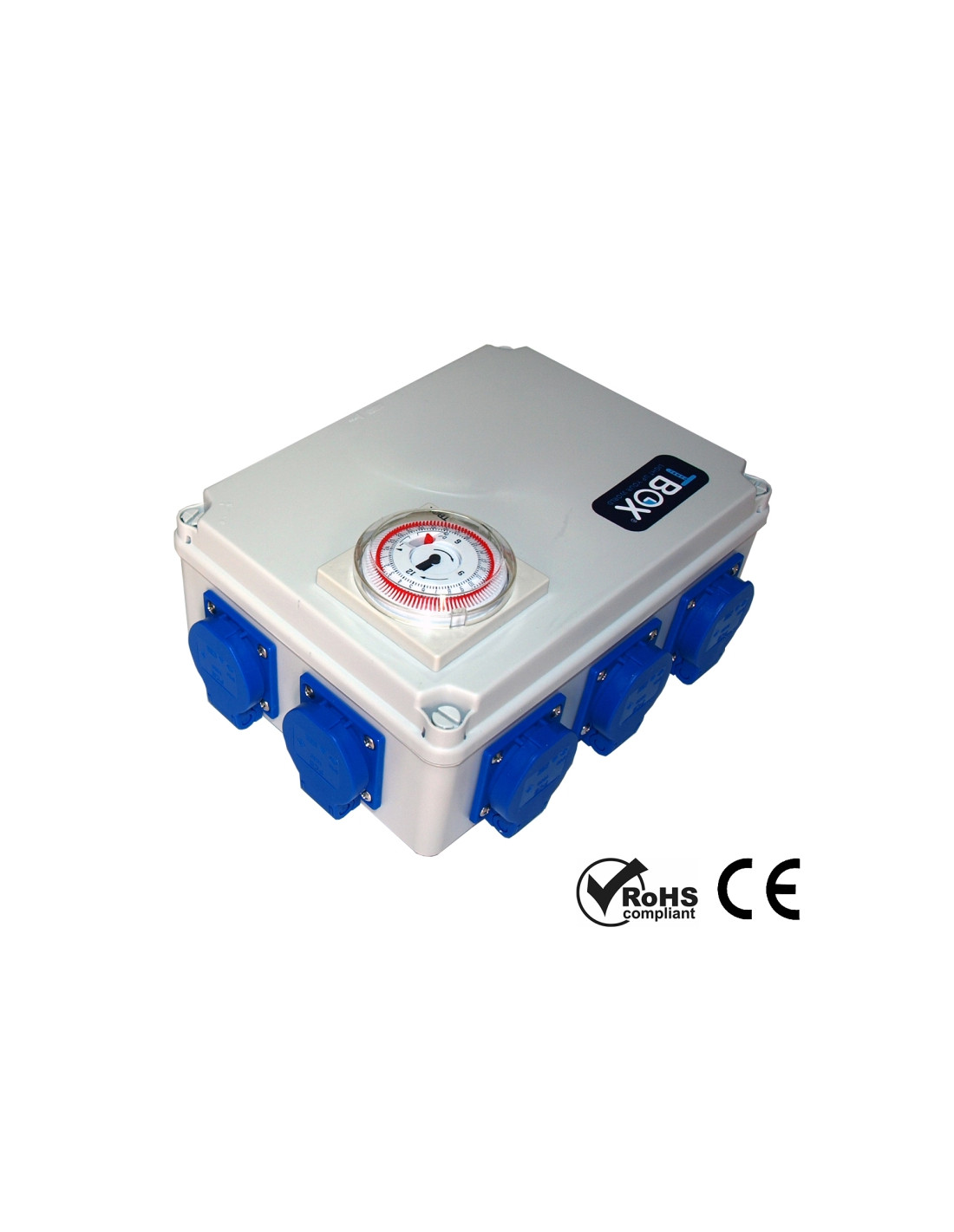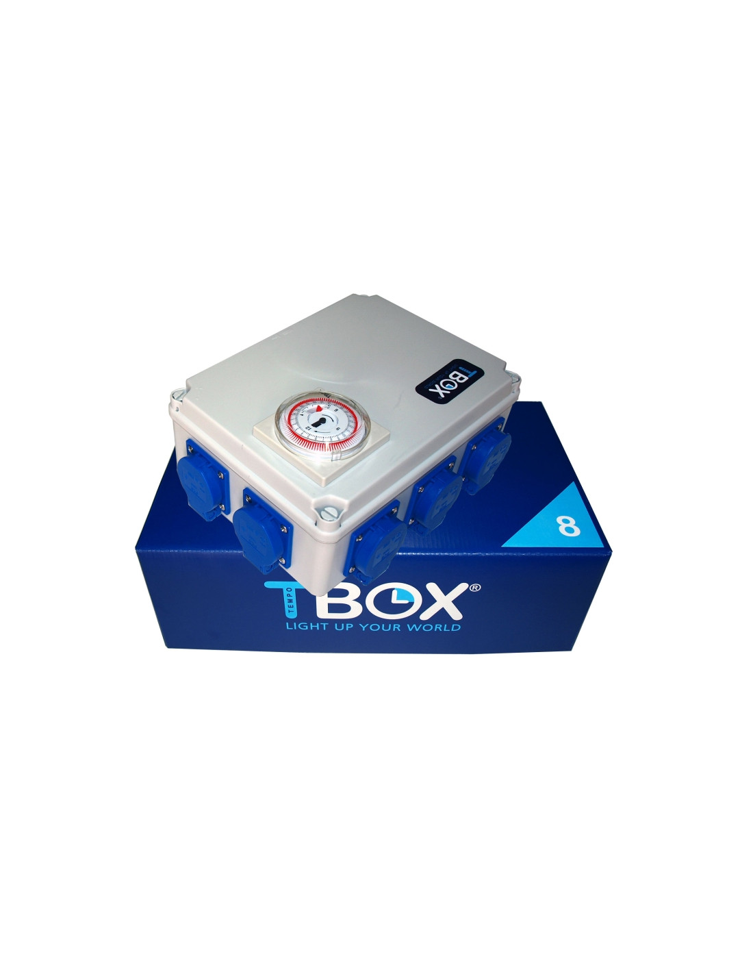 TBOX 8: es una caja temporizadora multibase que controla un máximo de 8 accesorios de 630w., 8 de 600w., 12 de 400w., 16 de 315w., ó 4 de 1.000w.